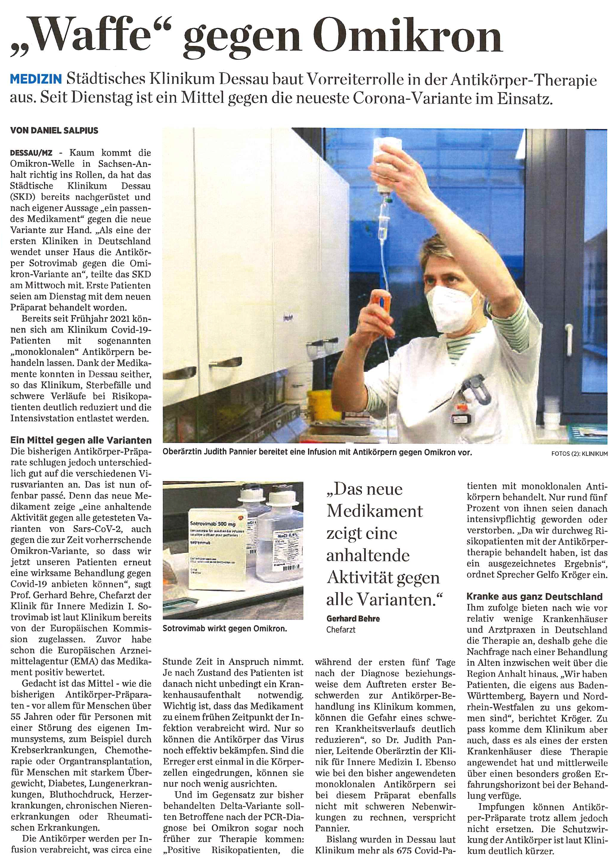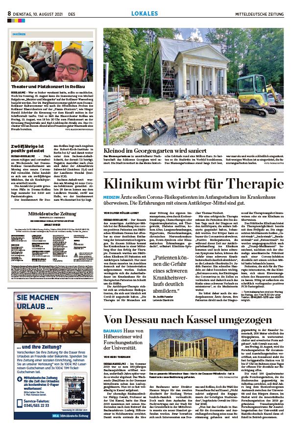 - Mitteldeutsche Zeitung vom 7. Dezember 2021: Klinikum Dessau setzt auf Corona-Antikörper-Therapie - 273 Patienten schon behandelt