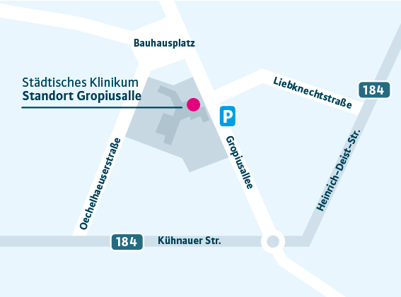 Für Patienten stehen zahlreiche Stellflächen in der Gropiusallee zur Verfügung. Unsere Empfehlung: Lassen Sie sich bringen und abholen oder nutzen Sie ein Taxi.