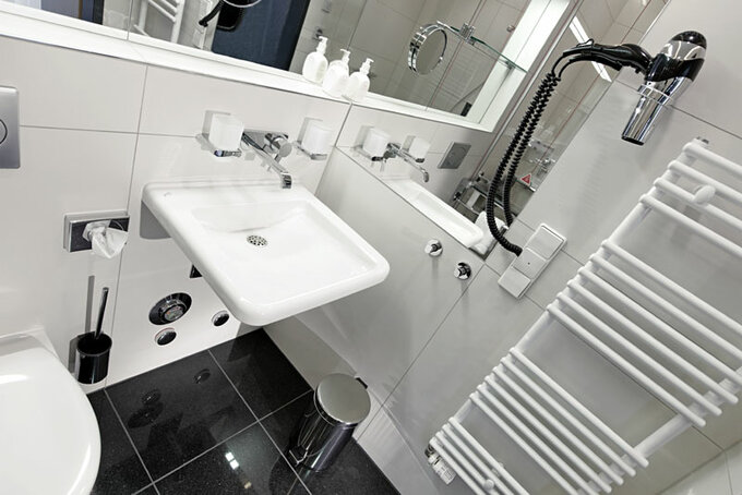 • Handtücher, Bademantel, Fön und eine Auswahl an Kosmetikartikeln