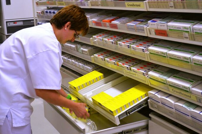 Die Medikamente erhalten Sie aus unserer hauseigenen Apotheke. Genau wie jede öffentliche Apotheke hat diese die Aufgabe, für jeden Patienten die benötigten Arzneimittel zum richtigen Zeitpunkt zur Verfügung zu stellen. Bei der Vielzahl angebotener Medikamente mit gleichem Wirkstoff oder gleichem Wirkungsspektrum ist es nicht immer möglich, das Mittel eines bestimmten Herstellers vorrätig zu halten. In enger Zusammenarbeit mit den Ärzten wird jedoch immer ein Präparat bereitgestellt, das wirkstoff- oder wirkungsgleich ist. In der Apotheke werden Arzneien auch nach ärztlicher Verordnung z.B. für die Chemotherapie individuell hergestellt.