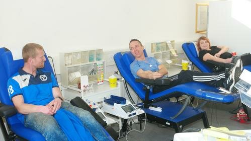 Inspiriert von ihrer Medizinfrau und der Zeitungsnotiz, dass in den letzten Wochen nicht nur das öffentliche Leben, sondern auch das Blutspendeaufkommen deutlich zurückgegangen ist, entschlossen sich die Kicker, etwas dagegen zu tun. Zunächst einmal mit gutem Beispiel voranzugehen. 15 Mannschaftsspieler erschienen jetzt beim DRK Blutspendienst, um sich jeweils einen halben Liter für den guten Zweck abzapfen zu lassen.