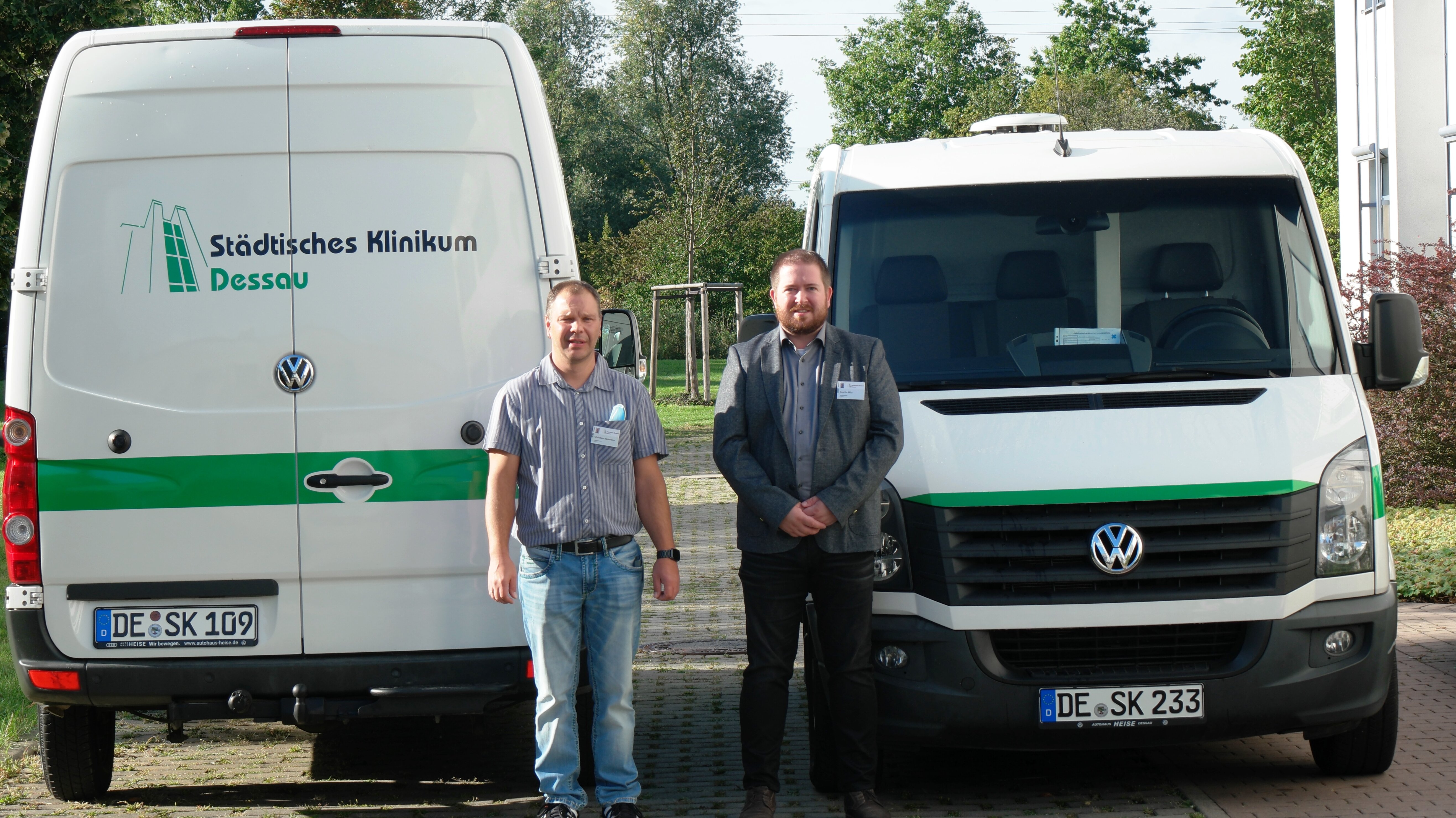 Ersetzt werden sie durch zwei Jahres-Fahrzeuge vom Typ VW Crafter: Größer, komfortabler und klimatisiert sind die Nachfolger. „Wir wollen unseren Mitarbeitern eine gute Ausstattung mit ordentlichem Sitzkomfort bieten“, so Sascha Witt, der neue Abteilungsleiter Logistik. Darüber hinaus bieten die beiden 3-Tonner, die Möglichkeit, reine und unreine Transporte sauber voneinander zu trennen, zumal der eine Crafter mit einem Kühlaggregat ausgestattet ist. Hier kann im Laderaum auch bei sommerlicher Hitze eine konstante Temperatur von 7 Grad gehalten werden - ideal für Essens- und Medikamententransporte.