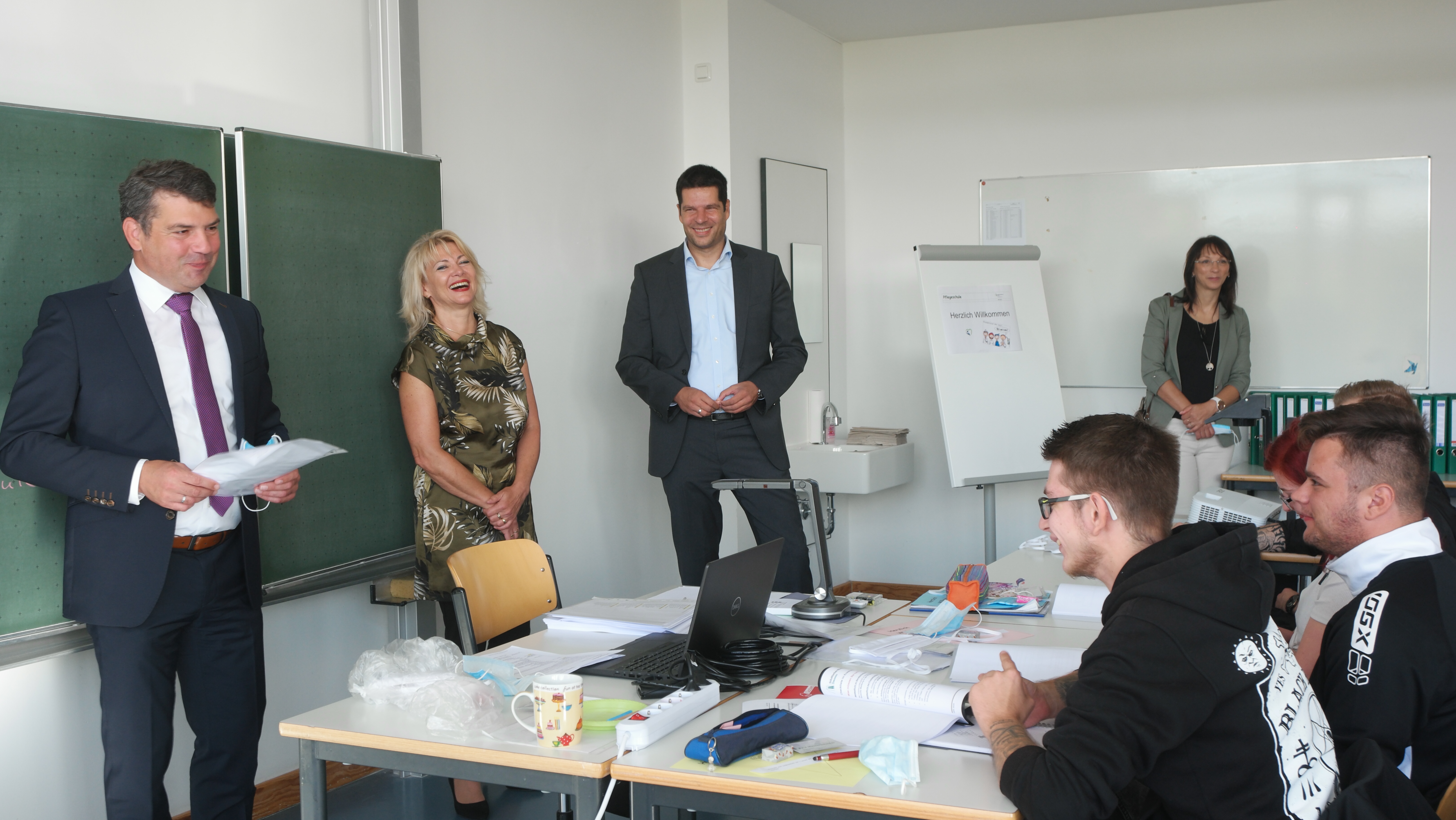 Den Auftakt zur Generalistischen Pflegeausbildung in Dessau-Roßlau nutzten Jens Krause, Beigeordneter für Gesundheit, Soziales und Bildung, und Pflegedienstleiter Dipl.-Pflegewirt Daniel Behrendt, MPH, heute zu einem Vor-Ort-Termin im Anhaltischen Berufsschulzentrum „Hugo Junkers“ und in der Pflegeschule des Städtischen Klinikums. Die Pflegeschule, die Träger der Ausbildung ist, nutzt beide Standorte für den theoretischen Teil der Ausbildung. Die Stadt hatte im vergangenen Jahr entschieden, dort die dreijährige Ausbildung zur Pflegefachfrau/-mann zu konzentrieren.