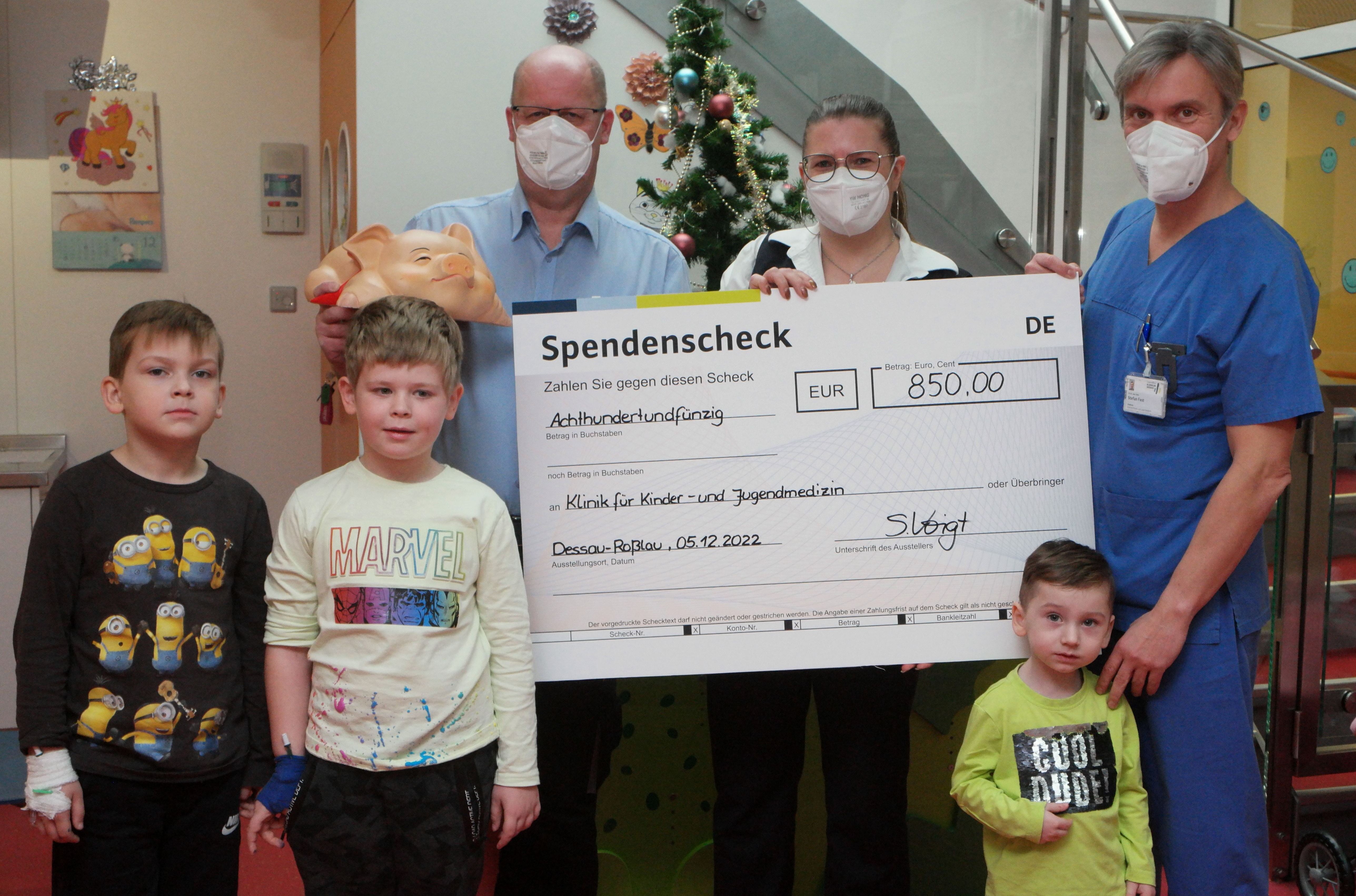 „Ein Service“, so Sylvana Voigt, „den wir seit Oktober mit einem Spendenaufruf verbunden haben.“ Auf dem Empfangstresen wurde ein Spendenschweinchen aufgestellt, das sich offenbar schnell füllte. Denn nach nur drei Monaten kam der stolze Betrag von 850 Euro zusammen, den das Team aus Empfang und Sicherheitsdienst nun der Kinderklinik in Person von Chefarzt Priv.-Doz. Dr. med. habil. Stefan Fest überreichte. Der freute sich über den Einsatz der Kollegen für die Kinder seiner Station und kündigte an: „Wir werden das Geld verwenden, um den Spielbereich unserer Station weiter zu verschönern, damit unsere kleinen Patienten möglichst wenig daran erinnert werden, dass sie im Krankenhaus sind.“