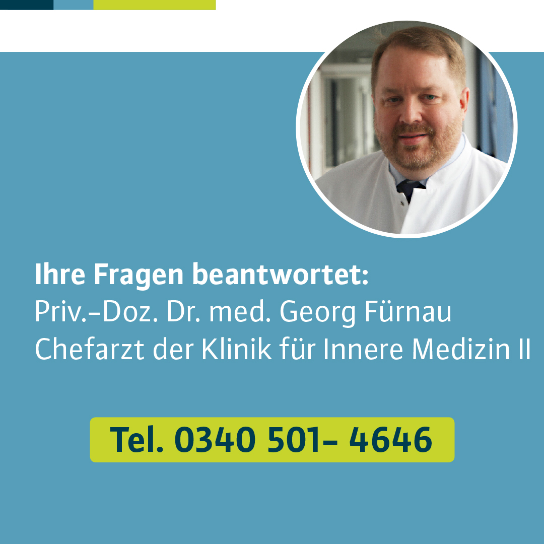 Sie erreichen Dr. med. Georg Fürnau zwischen 15:30 und 16:30 Uhr unter der Telefonnummer 0340 501- 4646.
