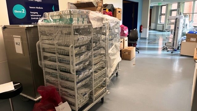 Damit allein war es natürlich nicht getan: Genauso wie die Logistik waren auch die Teams der Reinigung, der IT und auch der Urologie selbst gefordert, damit die Computer liefen, die Medikamentenschränke aufgefüllt waren, und die Klinik heute um 7 Uhr am neuen Standort volle Einsatzbereitschaft vermelden konnte. Noch um 5 Uhr in der Früh fand die Schlussdesinfektion statt, danach konnten Pfleger und Ärzte ihre neuen Arbeitsplätze übernehmen. Sechs Patienten waren auch schon da, sie waren ebenfalls per Krankentransport von der Gropiusallee an den Auenweg umgezogen. Operiert wurde auch schon, am Nachmittag, ein Notfall. Ohne Komplikationen – die vielen Umzugshelfer haben ausgezeichnete Arbeit geleistet.