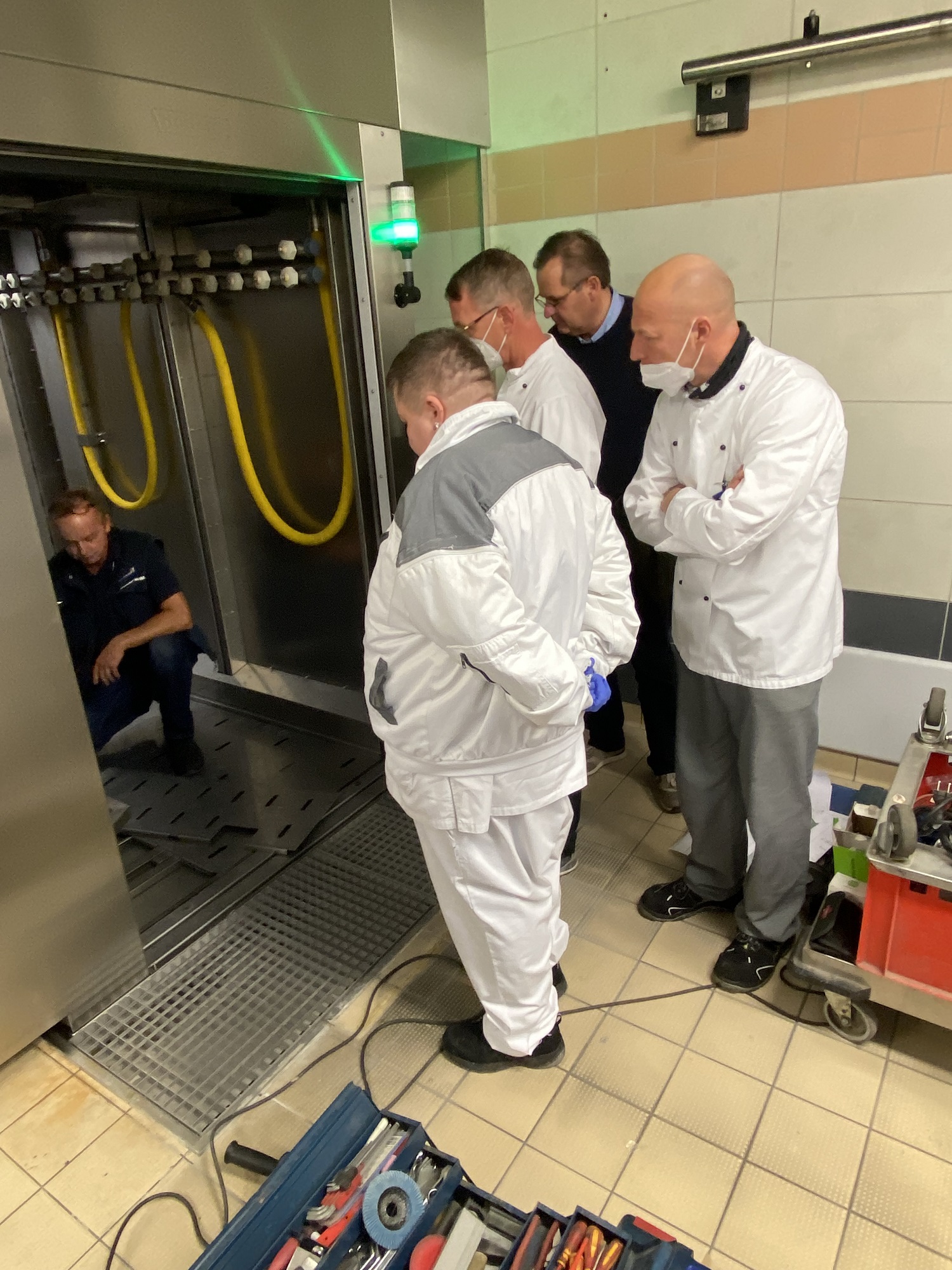 Um nicht nur die Speisereste, sondern auch Keime wirksam zu beseitigen, läuft seit Mittwoch eine neue Großkammerwaschanlage in der Küche. Sie reinigt und desinfiziert die Speisetransportwagen. Die Anlage kann, wenn nötig, rund um die Uhr in Betrieb sein. Vor allem jedoch in den Spitzenzeiten, wo jeder saubere Transportwagen benötigt wird.