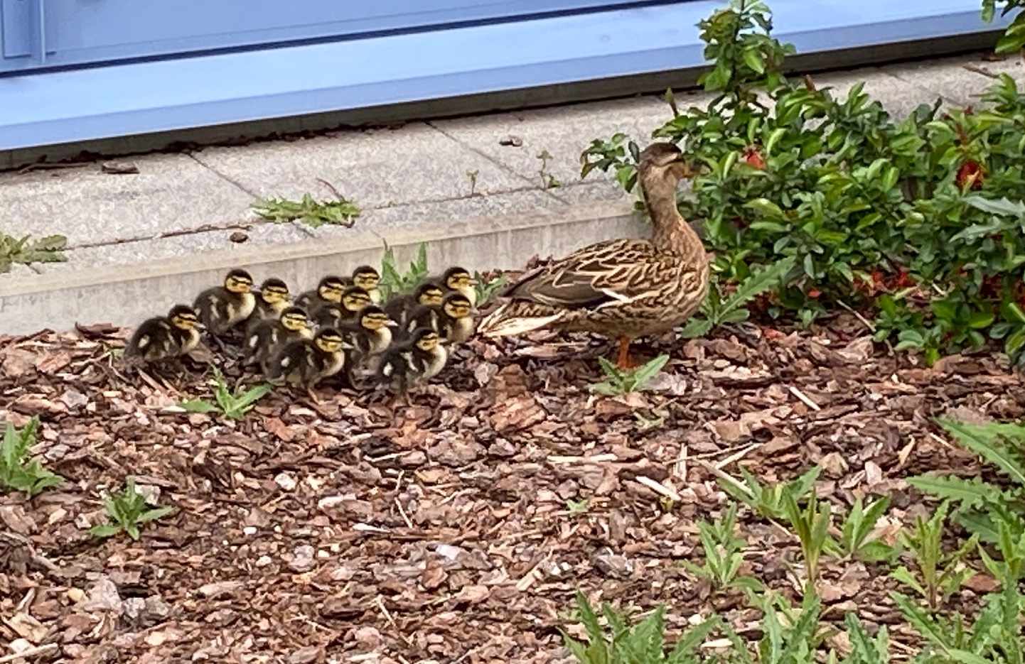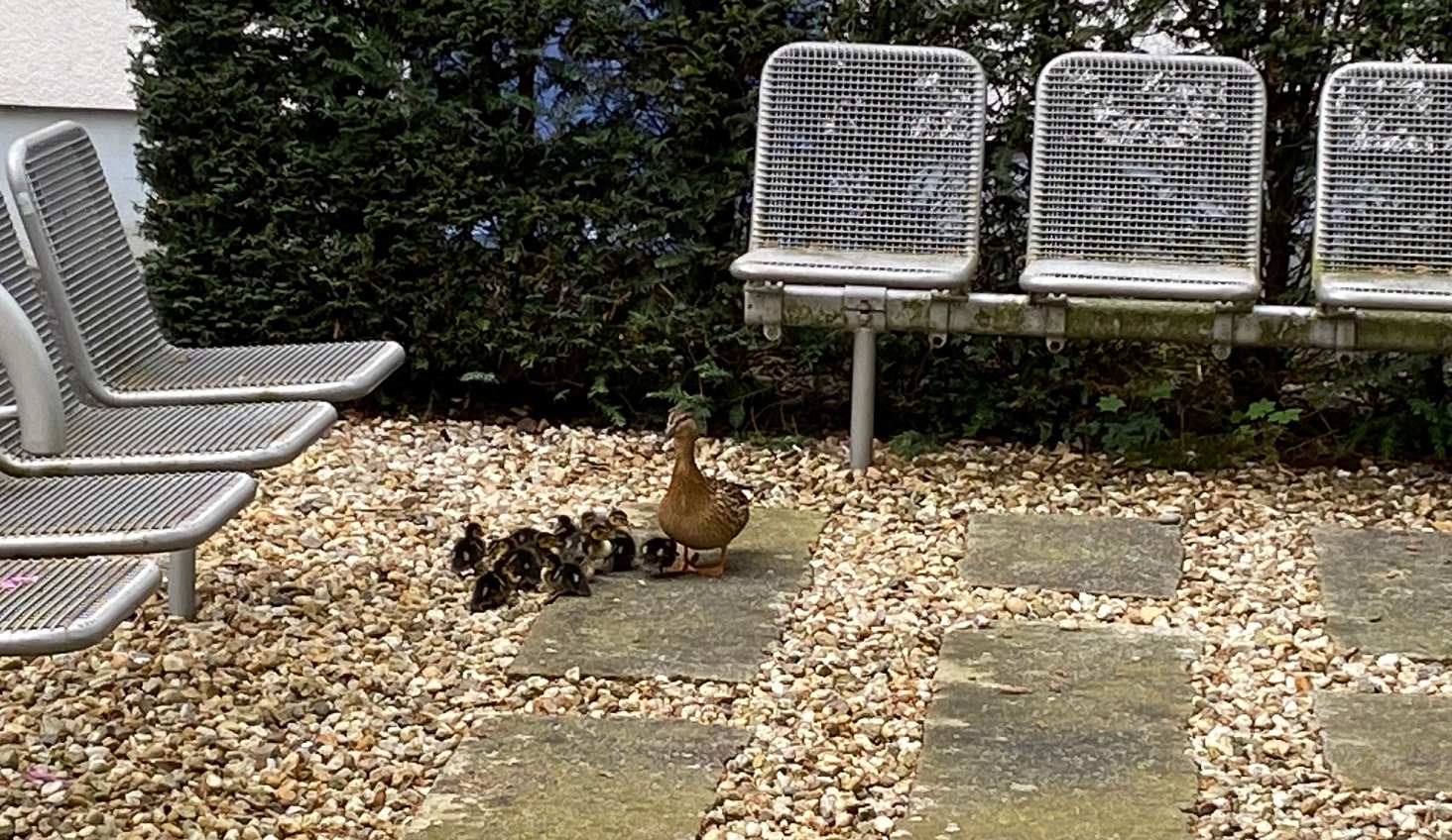 Es war am Donnerstagmorgen, als Schwester Sabrina, Bereichsleiterin der Interdisziplinären Fachambulanz, die Enten-Mama mit ihren 13 Küken in einem der Innenhöfe entdeckte. Das Tier war mit seinem Nachwuchs vergeblich auf der Suche nach einem Weg zum Teich im Patientenpark. Wohl schon seit Stunden lief die Ente mit dem Nachwuchs im Schlepptau in diesem Bereich, sich vor zu aufdringlichen Menschen im Gesträuch versteckend, hin und her.
