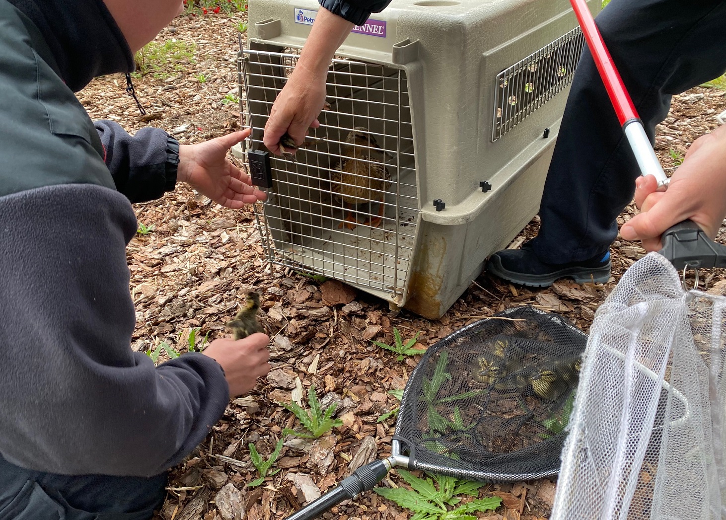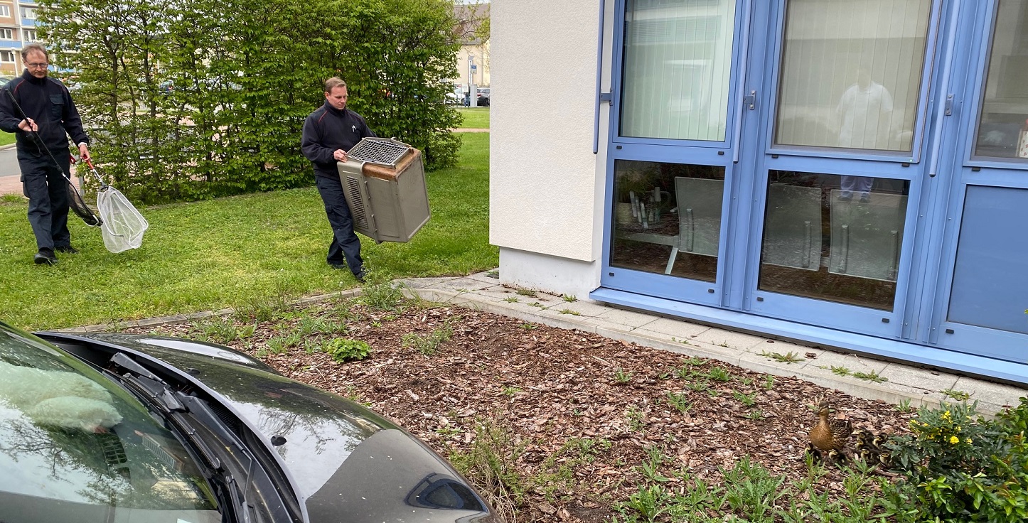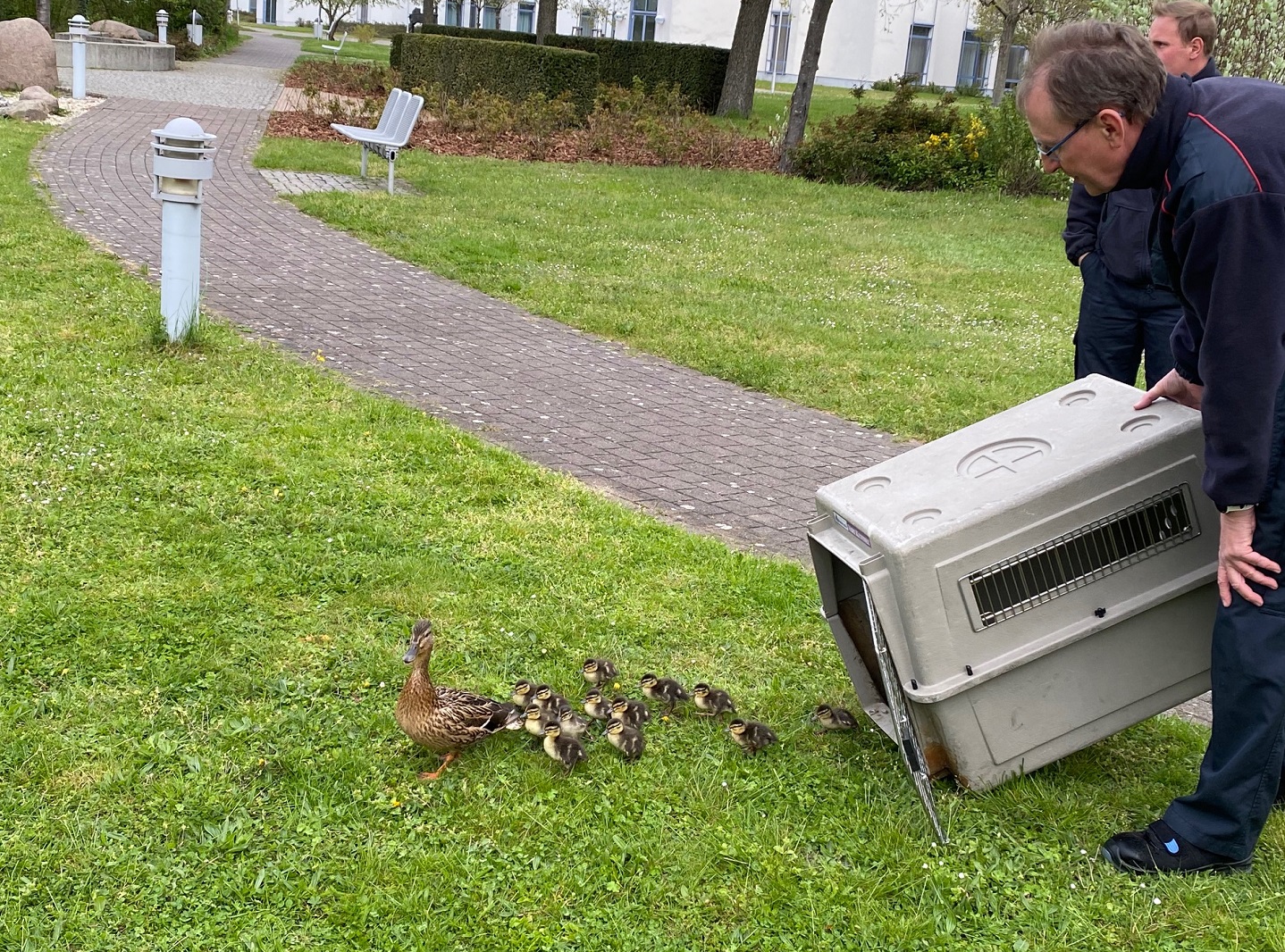 Mit gekonntem Blick wurde die tierisch-verzweifelte Situation erfasst und zu Kescher und Transportbox gegriffen. Vor dem Gebäude des Onkologischen Zentrums wurde mit sanftem Nachdruck das Muttertier eingefangen. Danach war es nur noch eine Frage der Zeit, der 13 Küken habhaft zu werden. Das Geschnatter war zwar groß, doch alle Tiere wurden wohlbehalten in der Transportbox untergebracht.