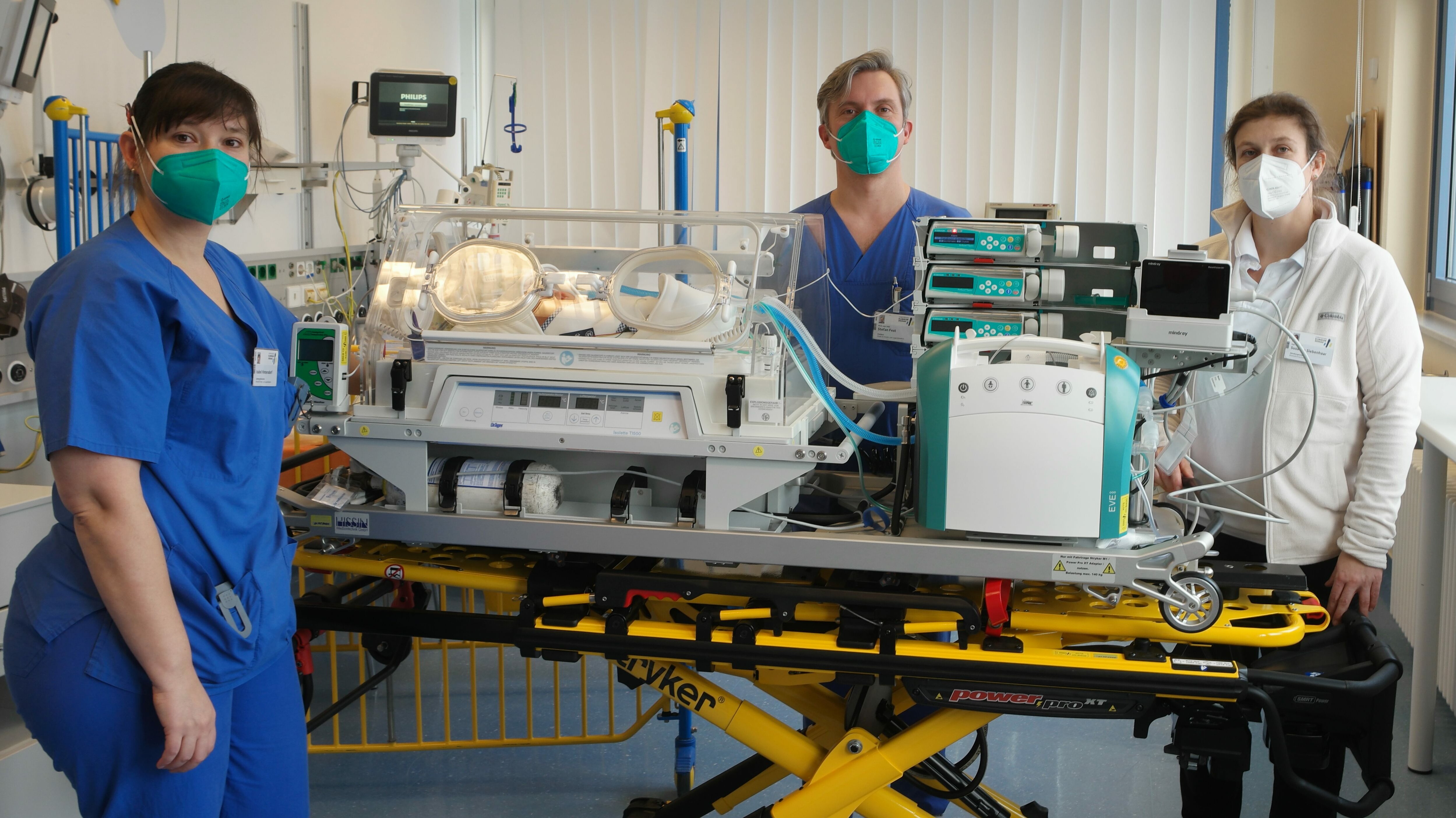 Im Klinikum angekommen wird das Neugeborene von den Kollegen der Neonatologie in Empfang genommen und auf dem schnellsten Wege auf die Kinder-Intensivstation gebracht.