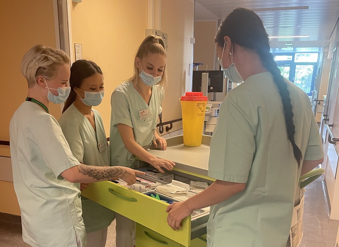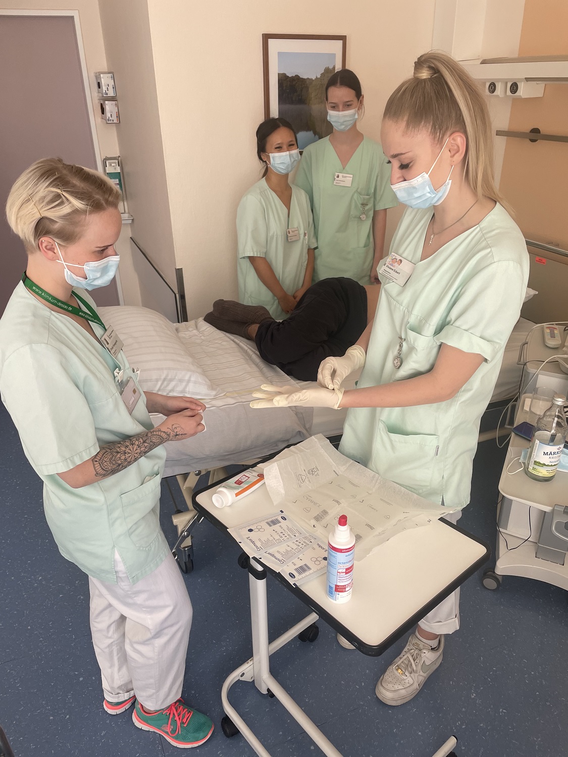 So werden auch auf der Station 03 (Klinik für Allgemein-, Viszeral- und Thoraxchirurgie) drei Auszubildende des Kurses 20-C von der Examensschülerin des Kurses 18/0 bei der Vorbereitung, Durchführung, Nachbereitung und Dokumentation eines Verbandswechsels angeleitet.