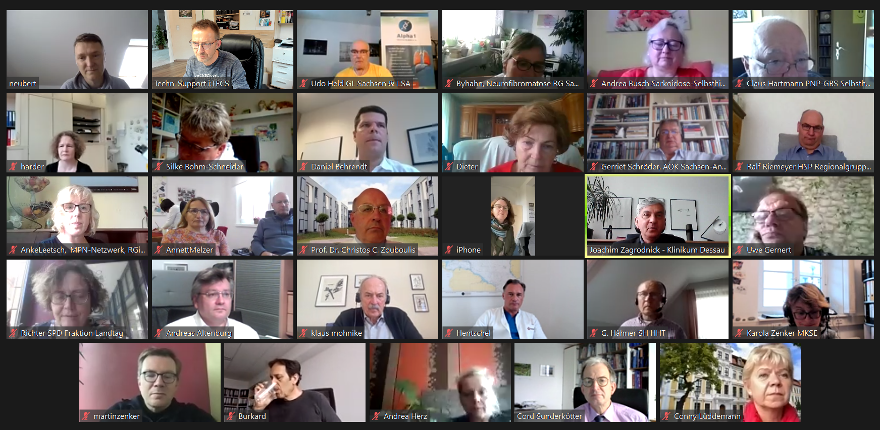 Dr. med. Joachim Zagrodnick, Ärztlicher Direktor des Städtischen Klinikums Dessau, und Prof. Dr. med. Prof. honoraire Dr. h. c. Christos C. Zouboulis, Chefarzt der Hochschulklinik für Dermatologie, Venerologie und Allergologie, Immunologisches Zentrum, sowie Annette Byhahn, Koordinatorin des Tages der Seltenen Erkrankungen und Leiterin der Neurofibromatose Regionalgruppe Sachsen-Anhalt, konnten Vertreter von Selbsthilfegruppen, der Ärztekammer, der Kassenärztlicher Vereinigung, der Krankenhausgesellschaft, von Krankenkassen, vom Mitteldeutschen Kompetenznetz Seltener Erkrankungen (MKSE), der Medizinischen Hochschule Brandenburg, der Universitätsklinik Brandenburg/Havel sowie Vertreter aus der Landes -und Bundespolitik in der Videokonferenz begrüßen.