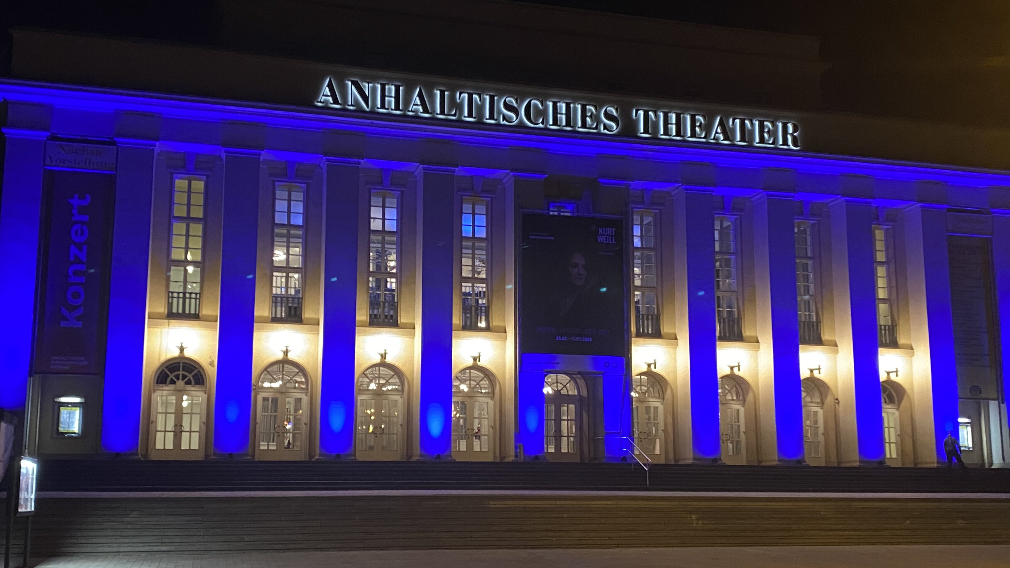 Zum Tag der Seltenen Erkrankungen erstahlt das Anhaltische Theater während der Abendvorstellungen in blau, eine der Farben des Rare Disease Day. Besonders in Covid-Zeiten soll damit auf die Anliegen der von Seltenen Erkrankungen Betroffenen aufmerksam gemacht werden. Ein großer Dank geht an das Anhaltisches Theater für die Lichtinstallation.