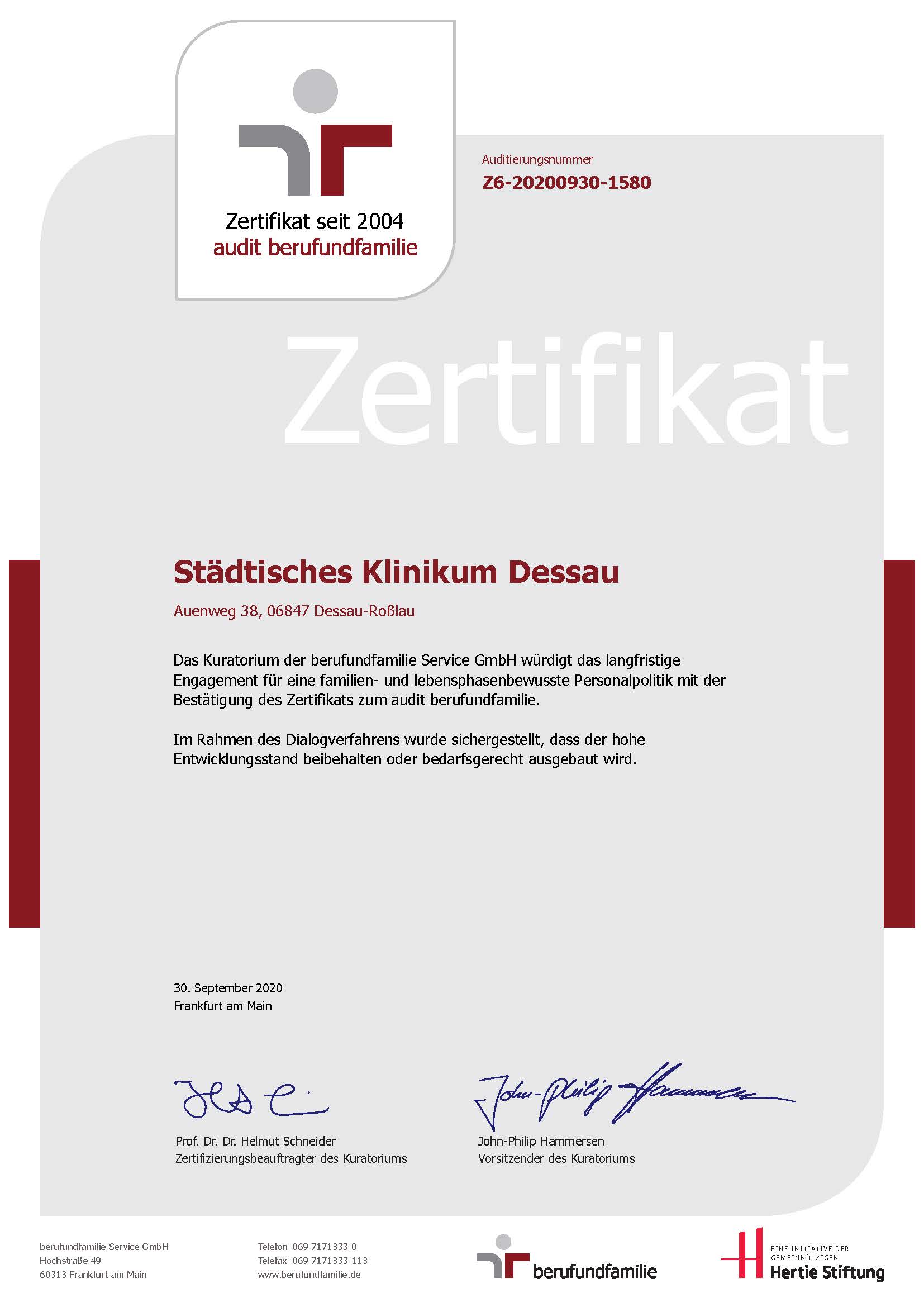 2004 erhielt das Klinikum nach bestandenem Audit erstmals das Zertifikat "berufundfamilie". Im Drei-Jahres-Rhythmus wird überprüft, ob die Voraussetzungen nach wie vor erfüllt sind. Damit gehört das Klinikum zur Riege der über 1.800 Unternehmen, Institutionen und Hochschulen im Land, die das seit 1998 angebotene audit erfolgreich durchlaufen haben.